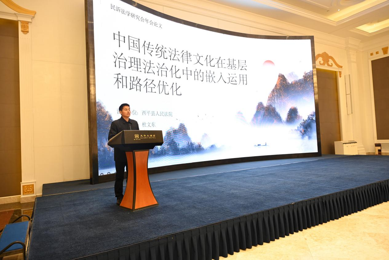 “研讨主题一”阶段,杜文东院长围绕“传统法律文化与审判实践”主题,作了题为《中国传统法律文化在基层治理法治化中的嵌入运用和路径优化》的交流发言。主要阐述了中国传统法律文化与基层治理法治化存在价值同构与功能互补,并循“内涵—契合—需求—路径”四阶段论述具体内容,以期推动传统与现代从“二元对立”走向“文化—制度—技术”三重耦合,形成基层法治新生态,为基层和谐与高质量发展提供持续内生动能。阶段发言结束后,郑州轻工业大学教授郑世保,河南财经政法大学讲师宋艳菊针对研讨主题进行了精彩与谈。与谈内容紧扣实践,观点明晰,论证严谨,既从理论层面探讨了中国传统法律文化的内容,又从实务角度提出了建设性思考,为我院深化中国传统法律文化研究提供了更多理论支点,也为今后从司法实务与实效举措双重路径出发促推相关学术建设与业务转化注入了可操作思路与可行性方案。无论是交流发言还是与谈观点,都获得了与会同仁的积极反响。目前,我院该篇一等奖论文被推荐入选论文汇编,正在接受专家审稿。