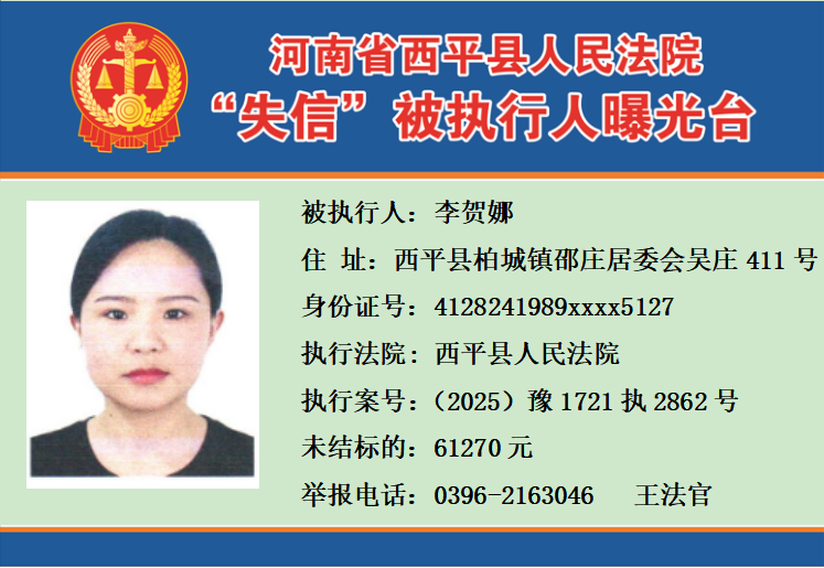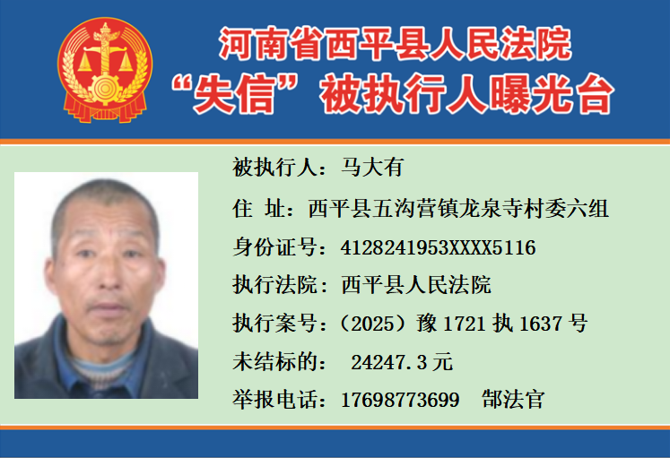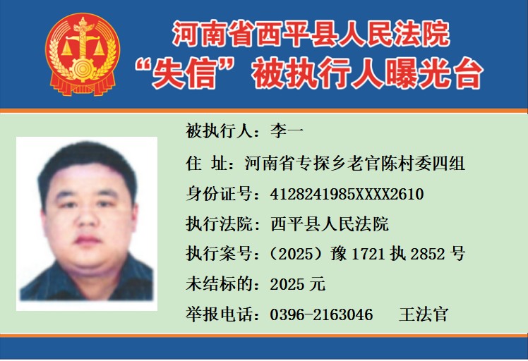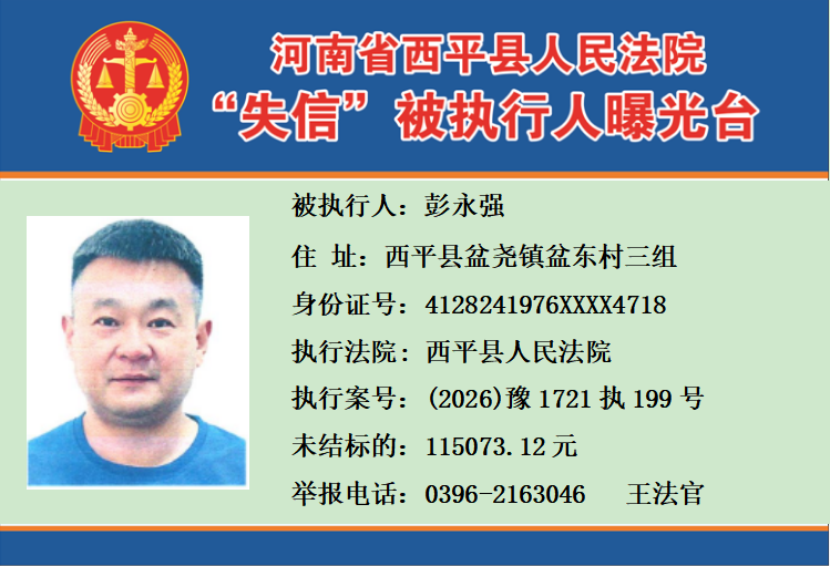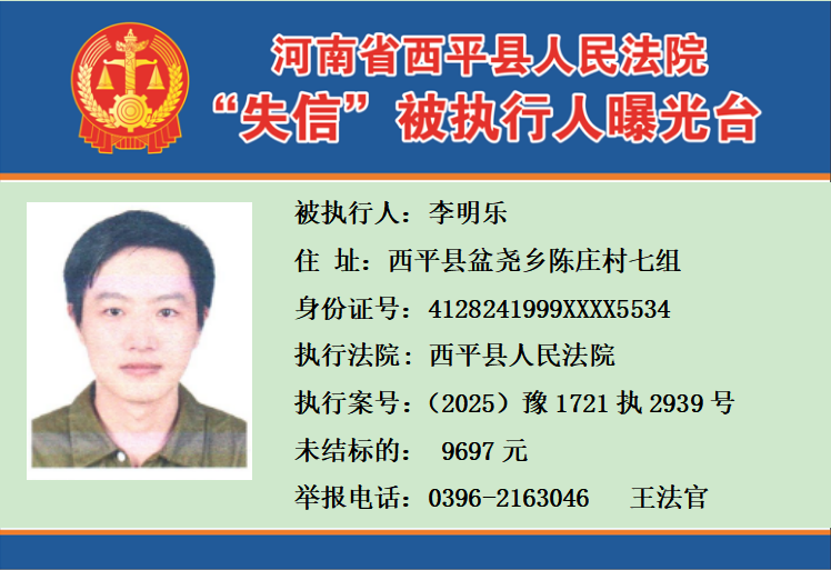 为维护法律的权威与尊严,保护胜诉当事人的合法权益,促进社会诚信体系建设,根据最高人民法院《关于公布失信被执行人名单信息的若干规定》及相关法律规定,西平县人民法院现对以下拒不履行人民法院生效法律文书确定义务的失信被执行人予以公布,督促其自觉履行义务,欢迎社会各界予以监督,如发现被公布的失信被执行人行踪和财产线索,可向西平法院举报反映,法院会对举报人的举报予以保密。