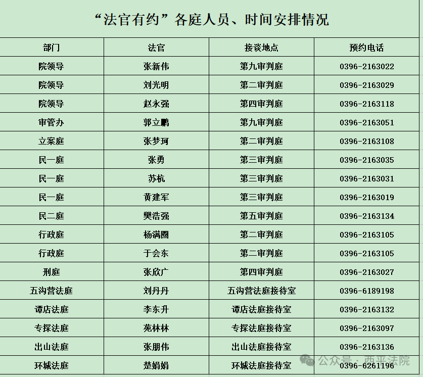 为进一步提升司法服务水平,畅通当事人与法官沟通渠道,按照市法院统一安排部署,本周五(3月20日)下午由院领导、办案法官为案件当事人面对面释法答疑解惑。为便于当事人联系约见,现将西平法院“法官有约”接待安排公示如下: