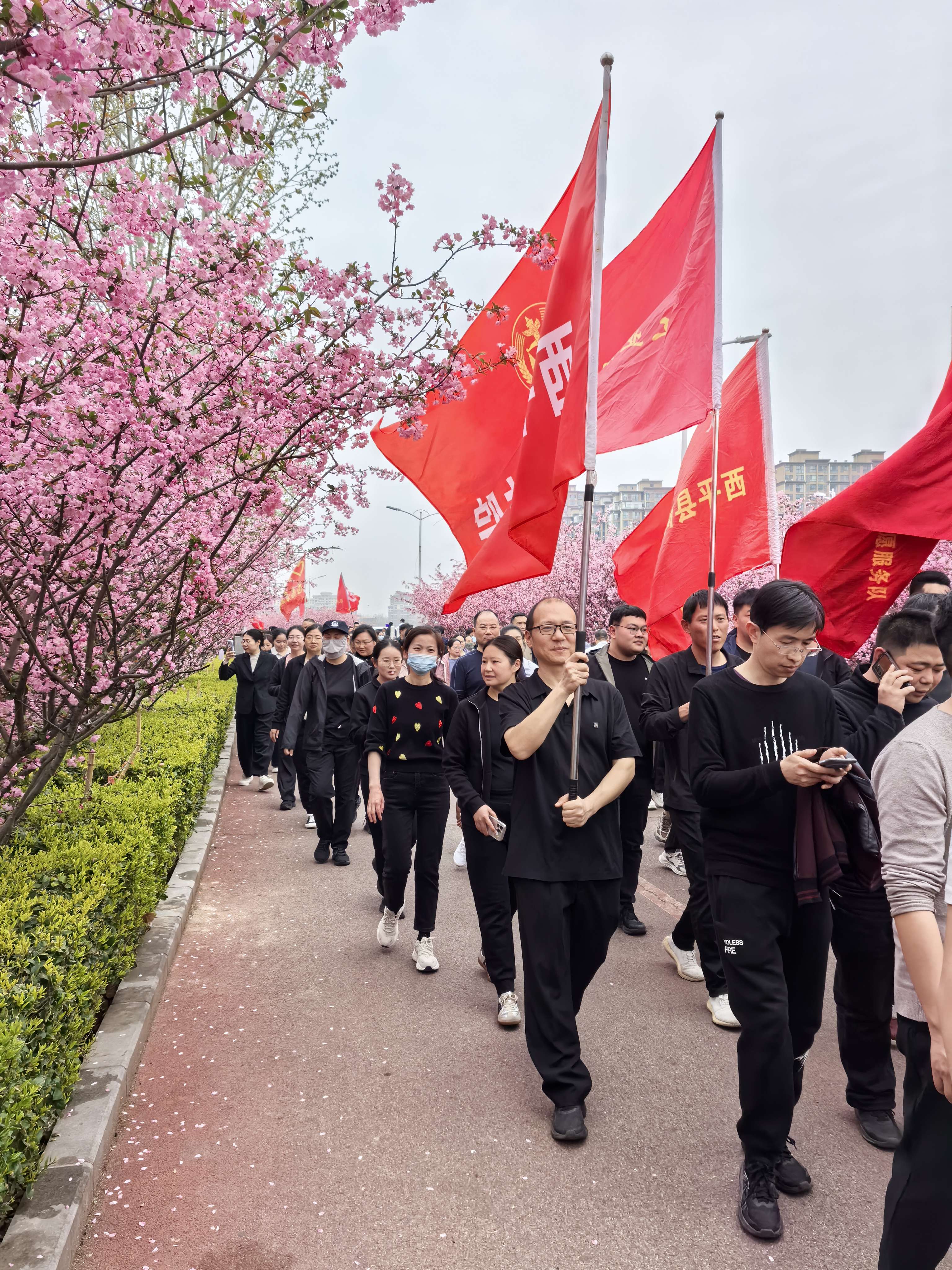 活动当日,阳光和煦,洪河两岸海棠花竞相绽放,粉白相间的花海与波光粼粼的河水交相辉映。干警们身着轻便运动装,精神抖擞地沿着规划路线阔步前行。队伍中既有经验丰富的资深法官,也有朝气蓬勃的青年干警,大家或结伴而行、畅谈工作感悟,或你追我赶、比拼速度耐力,欢声笑语回荡在春日林荫间。全程约5公里的健步走路线中,干警们以脚步丈量生态之美,用汗水诠释拼搏精神,成为一道亮丽的“法治风景线”。
